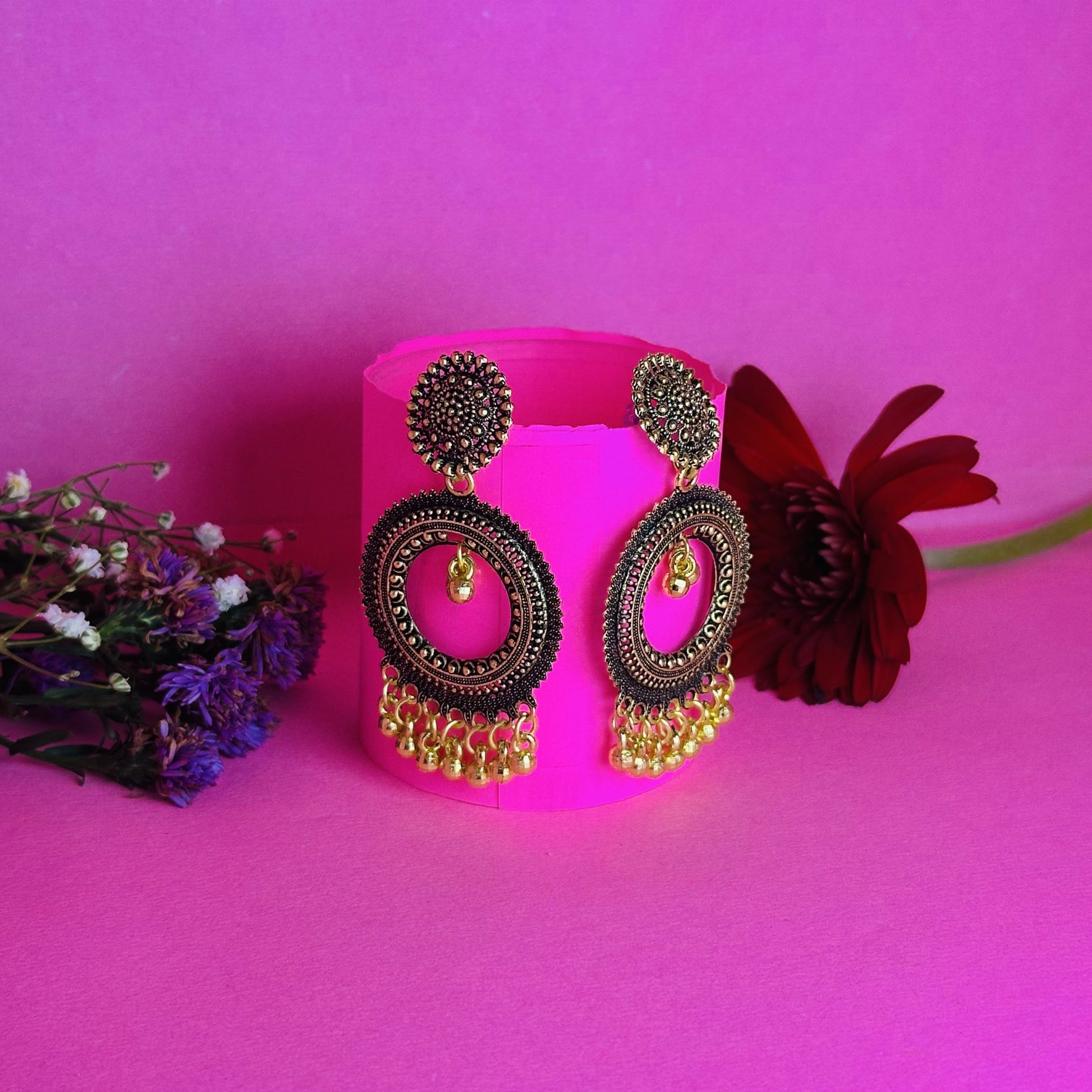 Elevate your ethnic style with this exclusive set of three distinct oxidized gold earrings. Each pair features intricate, traditional designs, from the elegant jhumka style with dangling beads to the modern, geometric-inspired pendants. These versatile pieces are perfect for pairing with a traditional saree, a festive lehenga, or adding a touch of bohemian charm to your everyday look.