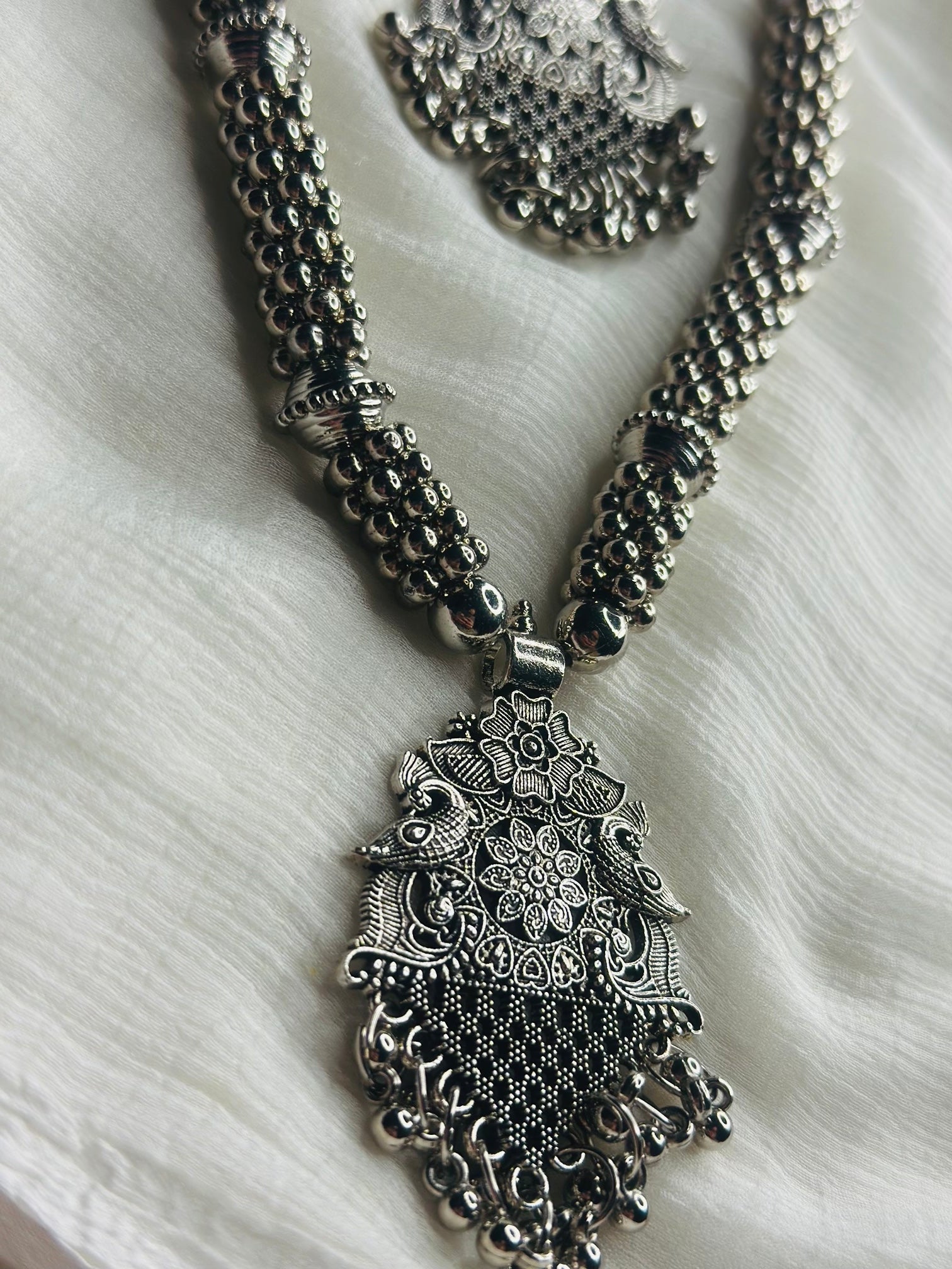 Celebrate Navratri in style with this exquisite oxidized silver long necklace set. Perfect for festive occasions and traditional wear, this set is a must-have for your ethnic jewelry collection.