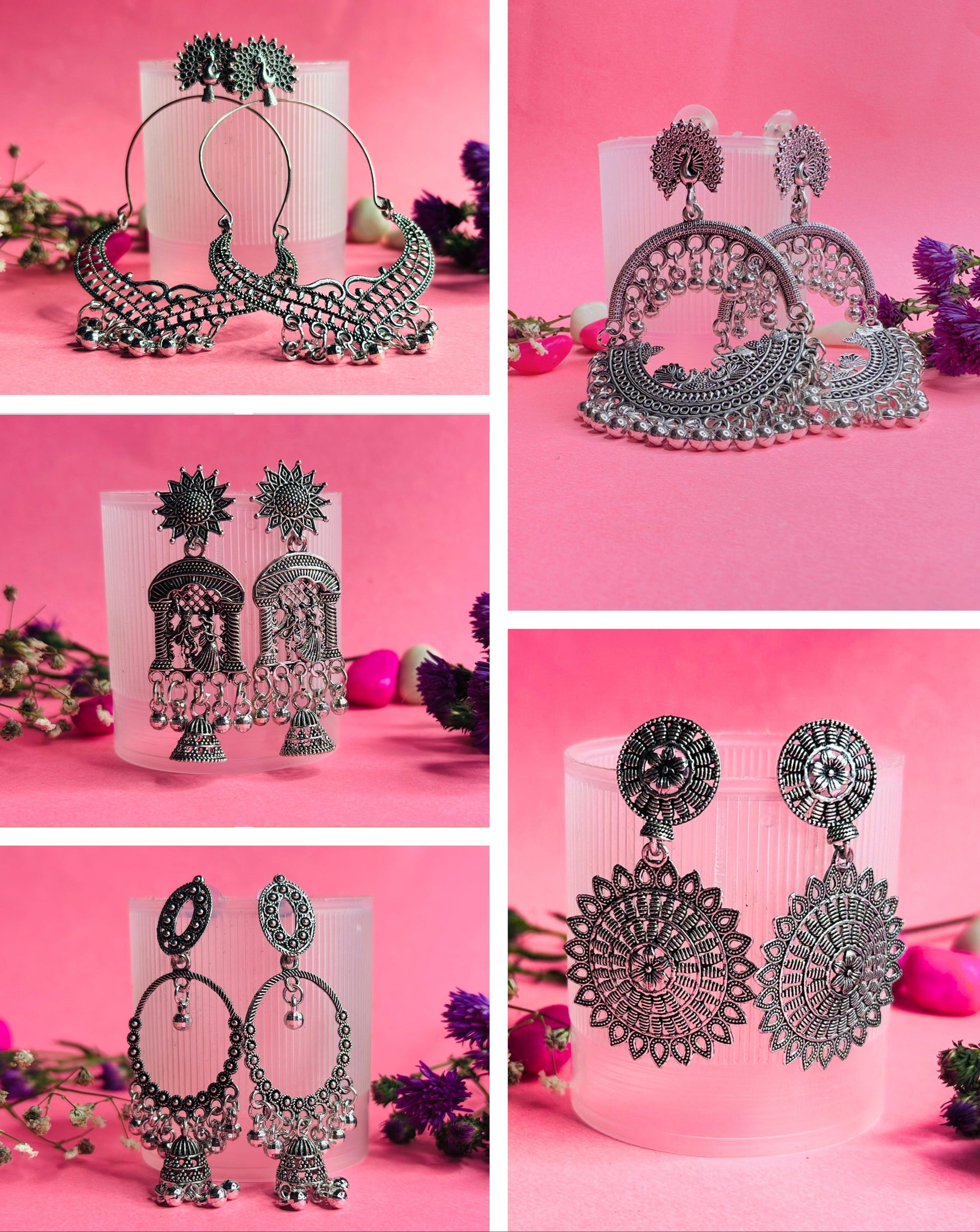 * A variety of oxidized silver-tone jhumka earrings: These handcrafted pieces feature intricate designs, from delicate peacock and lotus motifs to elegant ghungroo bells and unique tiered styles. Each pair is a unique statement piece that adds a touch of ethnic flair to any outfit.