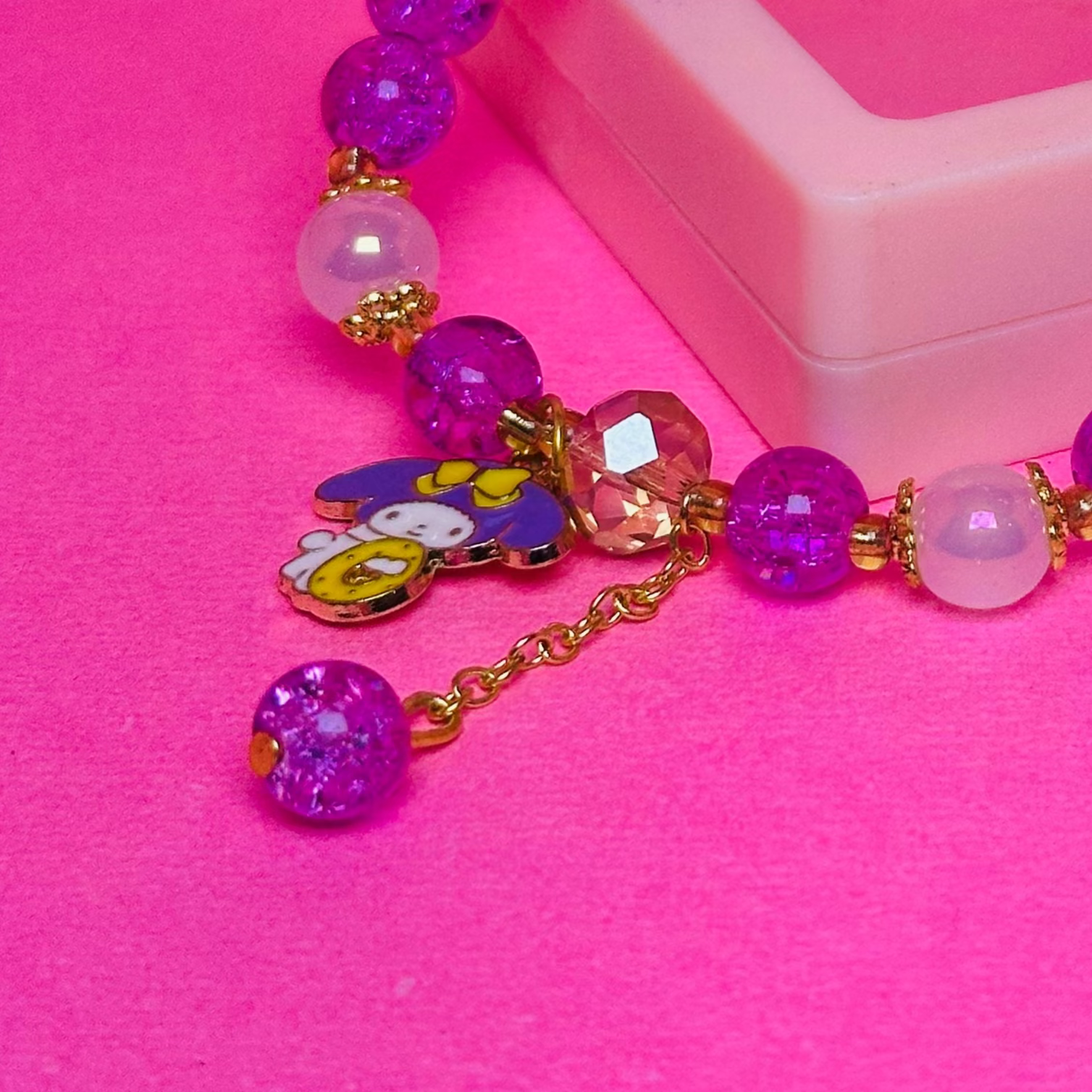 Add a pop of vibrant color and whimsical charm to your look with this delightful beaded bracelet. Each cracked quartz bead, in a dreamy shade of iridescent purple, sparkles with an intricate, shattered glass-like texture that catches the light beautifully. The shimmering beads are strung on a comfortable, stretchable band for a perfect fit. A tiny, gold-toned charm with a cute, colorful character hangs from the beads, adding a sweet and graceful finishing touch. This unique piece is perfect for adding a fun accent to your everyday outfit or for gifting to someone special.